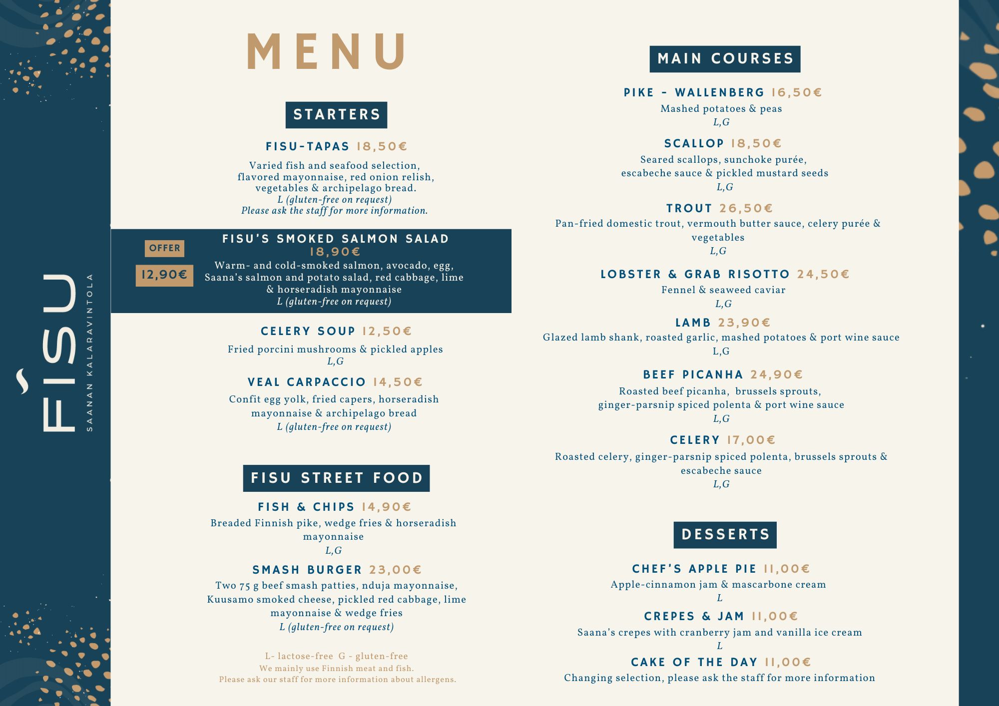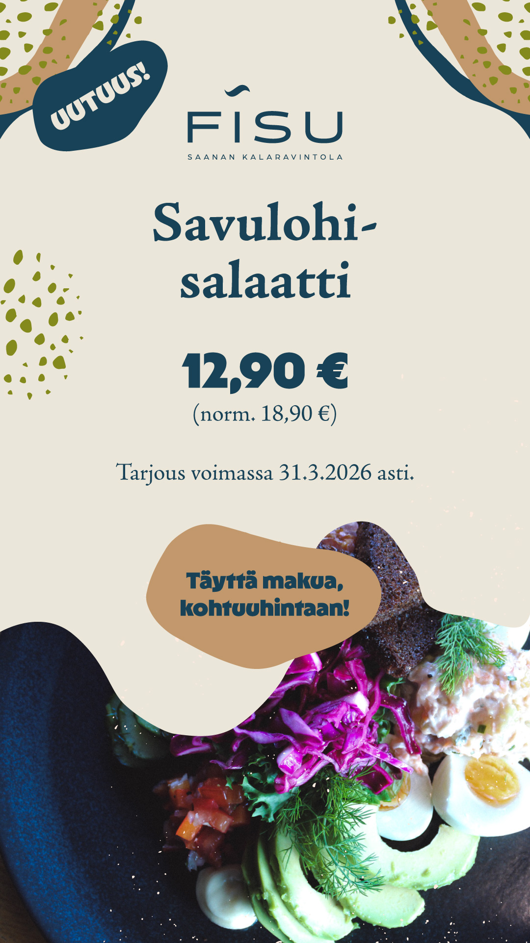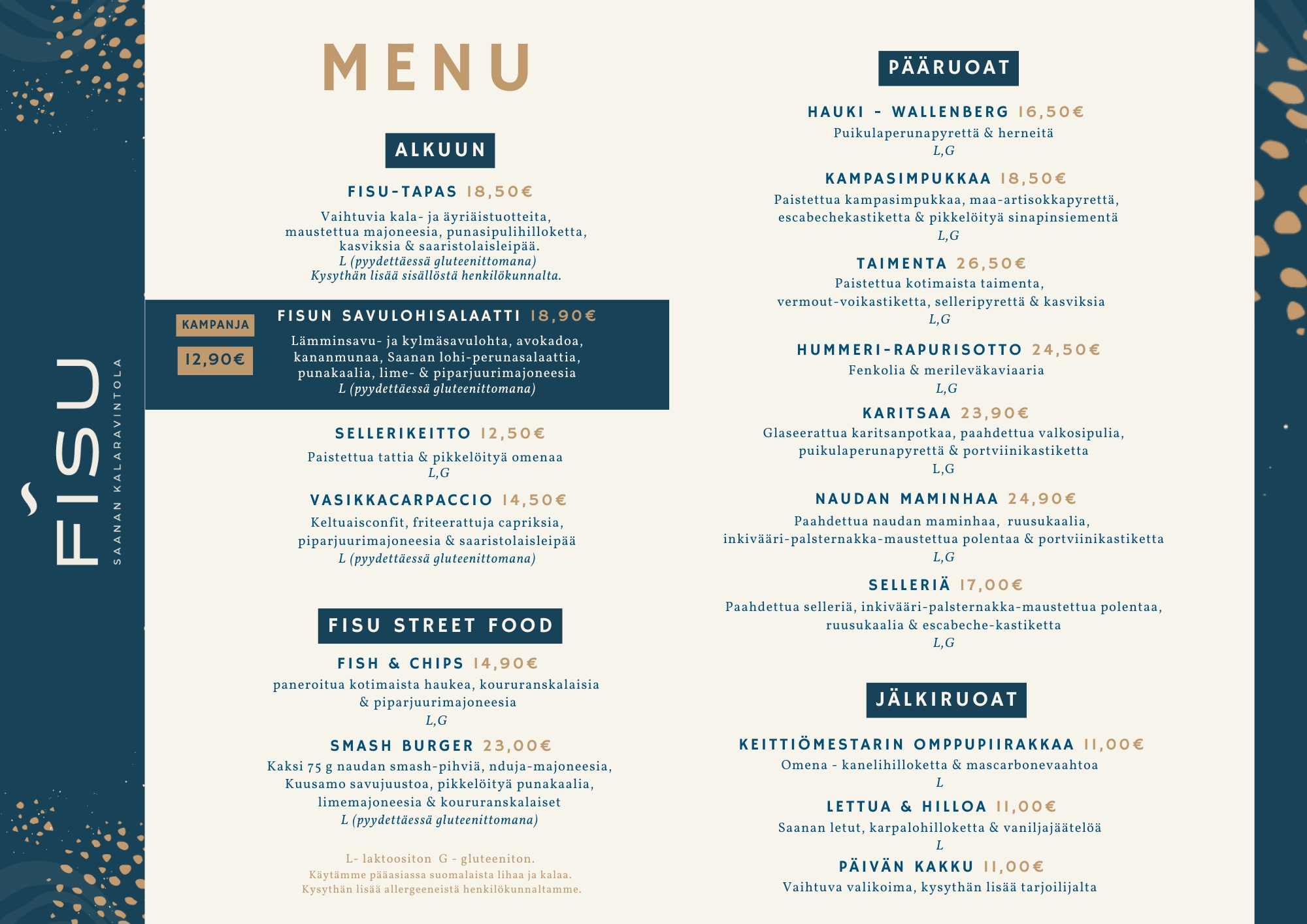 Saanan kalaravintola Fisun juuret ovat syvällä suomalaisissa vesissä ja kestävässä ajattelussa. Yhdessä Kalavapriikin ja Kalaonnin kanssa halusimme tuoda tuoreen, vastuullisesti pyydetyn kalan entistä lähemmäs asiakkaita – helposti, laadukkaasti ja herkullisesti nautittavaksi. Näin syntyi Kalaonni-Fisutiski, joka vie sinut hurmaavalle ja aistikkaalle makumatkalle kotimaisten vesien ja maailman merien antimien äärelle. Kalaonni sai alkunsa intohimosta makunystyrät nyrjäyttävän maukkaaseen ruokaan. Sellaiseen, joka tekee hyvää mielelle ja keholle. Kalaonni-tuotteet valmistava Kalavapriikki takaa, että jokainen suupala on armottoman laadukasta. Kallaveden laineiden välittömässä läheisyydessä Fisu valmistaa näistä raaka-aineista helposti lähestyttävää ruokaa – mutkatonta kalaruokaa jokaiselle laadukkaan ravinnon ystävälle.